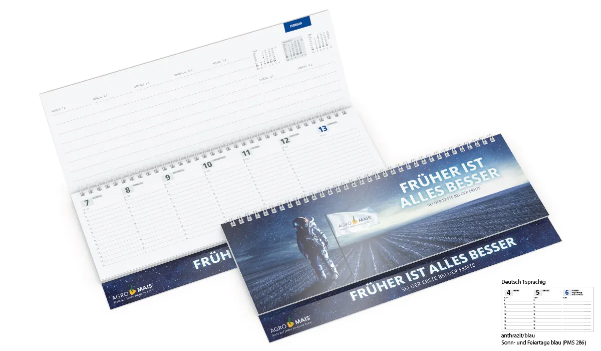 | Bestellung bis spätestens 19.06.2026 (Druckfreigabe muss bis spätestens 25.06.2026 vorliegen). Lieferung zu Ihrem Wunschtermin, wenn Sie diesen in Ihrer Bestellung angeben, spätestens jedoch zum 01.09.2026. Bestellungen ohne Wunschtermin liefern wir direkt nach Fertigstellung, jedoch nicht vor dem 01.07.2026. | Art.Nr.: | GE1060011 | Lieferzeit: | 2-5 Wochen | Gewicht: | 0,210 kg | Format: | 304 x 135 mm gesamt · 304 x 105 mm Kalenderblocks | Farbe: | gloss-individuell · matt-individuell | Einbandmaterial (Umschlag): | Polychrome: Karton-Einband gloss oder matt veredelt. | Kalendarium: | Deutsch 1sprachig · je Woche 2 Seiten · Stundeneinteilung von 8 bis 21 Uhr auf dem unteren Blatt · Notizraum und 3-Monats-Übersicht auf dem oberen Blatt · Informationsteil | Umfang: | 128 Seiten | Verarbeitung: | Wire-O-Bindung weiß | Option(en): | Wire-O-Bindung in Sonderfarben (ab 500 Stück) · Werbeseiten | Einzelverpackung: | Wellpapp-Verpackung weiß: Nr. 09 - 320 x 148 x 18 mm | Verpackungseinheit: | 80 | Werbefläche: | siehe Standbogen | Druck: | 4C-Quality Digitaldruck oder Offsetdruck (F) · Werbeseiten (W) | Druckfarben: | Digitaldruck oder Offsetdruck: 4C-Euroskala (F) · Werbeseiten: Digitaldruck oder Offsetdruck: 4C-Euroskala (W) | Mindestmenge: | 250 | Herkunftsland: | ![]() |