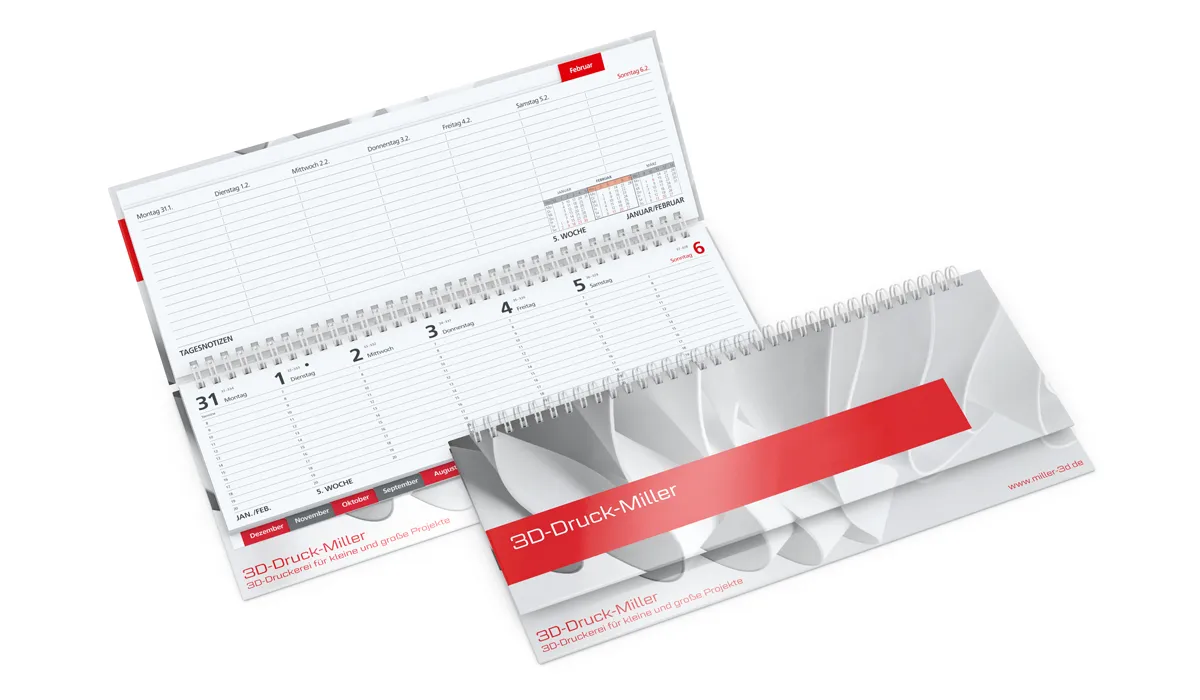 | Bestellung bis spätestens 19.06.2026 (Druckfreigabe muss bis spätestens 25.06.2026 vorliegen). Lieferung zu Ihrem Wunschtermin, wenn Sie diesen in Ihrer Bestellung angeben, spätestens jedoch zum 01.09.2026. Bestellungen ohne Wunschtermin liefern wir direkt nach Fertigstellung, jedoch nicht vor dem 01.07.2026. | Art.Nr.: | GE1080035 | Lieferzeit: | 2-5 Wochen | Gewicht: | 0,290 kg | Format: | 308 x 134 mm gesamt · 304 x 105 mm Kalenderblocks | Farben: | dunkelblau · schwarz · weiß | Einbandmaterial (Umschlag): | Der klassische und vielseitige Einband zeichnet sich durch seine Strapazierfähigkeit aus, die auch extremer Beanspruchung standhält. Der Kunststoff-Einband hat eine leichte Narbung und ist selbstverständlich voll recyclebar. | Kalendarium: | Deutsch 1sprachig oder International 6sprachig GB/F/E/I/D/RUS · je Woche 2 Seiten · Stundeneinteilung von 7 bis 20 Uhr auf dem unteren Blatt · Notizraum und 3-Monats-Übersicht auf dem oberen Blatt · Informationsteil | Umfang: | 128 Seiten | Verarbeitung: | Monats-Registerstanzung · Wire-O-Bindung weiß | Option(en): | Wire-O-Bindung in Sonderfarben (ab 500 Stück) · Werbeseiten | Einzelverpackung: | Wellpapp-Verpackung weiß: Nr. 09 - 320 x 148 x 18 mm | Verpackungseinheit: | 60 | Werbefläche: | siehe Standbogen | Druck: | Siebdruck (G) · Heißfolienprägung (I) · Siebdruck-Digital (U) · Werbeseiten (W) | Druckfarben: | Siebdruck: schwarz, weiß, gold, silber sowie Sonderfarben nach HKS oder Pantone (G) · Prägung: gold, silber, schwarz-glänzend, blind (I) · Siebdruck: 4C-Euroskala (U) · Werbeseiten: Digitaldruck oder Offsetdruck: 4C-Euroskala (W) | Mindestmenge: | 50 | Herkunftsland: | ![]() |
