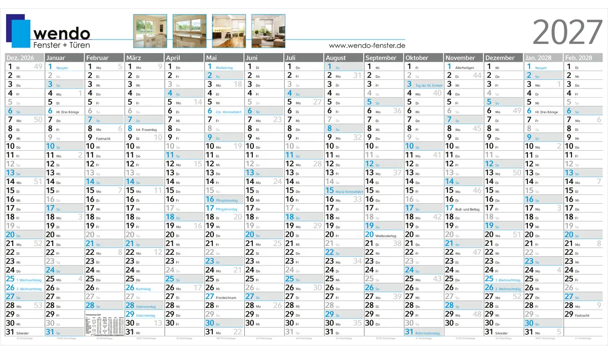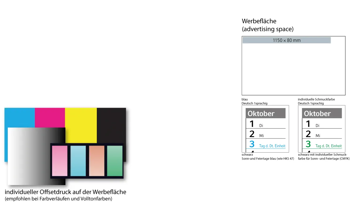 | Bestellung bis spätestens 19.06.2026 (Druckfreigabe muss bis spätestens 25.06.2026 vorliegen). Lieferung zu Ihrem Wunschtermin, wenn Sie diesen in Ihrer Bestellung angeben, spätestens jedoch zum 01.09.2026. Bestellungen ohne Wunschtermin liefern wir direkt nach Fertigstellung, jedoch nicht vor dem 01.07.2026. | Art.Nr.: | GE820003 | Lieferzeit: | 2-5 Wochen | Gewicht: | 0,180 kg | Format: | 1350 x 750 mm | Kalendarium: | Deutsch 1sprachig · 15 Monate: Dez. 2026 - Feb. 2028 · blau oder individuelle Schmuckfarbe · Jahreszahl (anthrazit) | Material: | weißer Karton | Option(en): | Wandpieker · Eindrucke innerhalb des Kalendariums auf Anfrage möglich | Einzelverpackung: | Viereckpack braun: Nr. 15 zum gerollten Postversand · Kunsthülle transparent: Nr. 07 zum persönlichen Verteilen | Verpackungseinheit: | 75 | Werbefläche: | 1150 x 80 mm | Druck: | Digitaldruck am Kopf inklusive (angeschnittener Druck standardmäßig nicht möglich) | Druckfarben: | CMYK | Mindestmenge: | 50 | Herkunftsland: | ![]() |