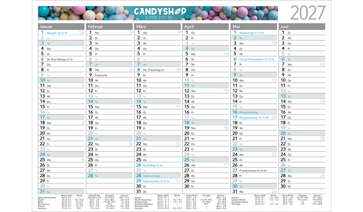 | Bestellung bis spätestens 19.06.2026 (Druckfreigabe muss bis spätestens 25.06.2026 vorliegen). Lieferung zu Ihrem Wunschtermin, wenn Sie diesen in Ihrer Bestellung angeben, spätestens jedoch zum 01.09.2026. Bestellungen ohne Wunschtermin liefern wir direkt nach Fertigstellung, jedoch nicht vor dem 01.07.2026. | Art.Nr.: | GE990002 | Lieferzeit: | 2-3 Wochen | Gewicht: | 0,011 kg | Format: | 210 x 148 mm | Kalendarium: | Deutsch 1sprachig · 6 Monate Vorderseite · 6 Monate Rückseite · blau oder individuelle Schmuckfarbe · Jahreszahl (hellgrau) | Material: | weißer stabiler Karton | Verpackungseinheit: | 1250 | Werbefläche: | 175 x 12 mm (Vorder- und rear) | Druck: | 4C-Quality Offset auf Vorder- und Rückseite inklusive | Druckfarben: | CMYK | Mindestmenge: | 100 | Herkunftsland: | ![]() |