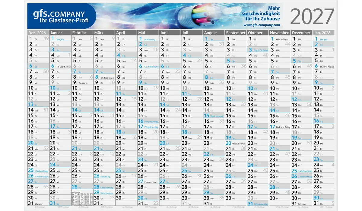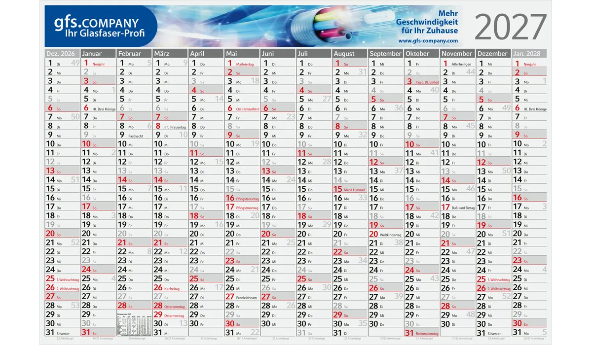 | Bestellung bis spätestens 19.06.2026 (Druckfreigabe muss bis spätestens 25.06.2026 vorliegen). Lieferung zu Ihrem Wunschtermin, wenn Sie diesen in Ihrer Bestellung angeben, spätestens jedoch zum 01.09.2026. Bestellungen ohne Wunschtermin liefern wir direkt nach Fertigstellung, jedoch nicht vor dem 01.07.2026. | Art.Nr.: | GE910002 | Lieferzeit: | 2-3 Wochen | Gewicht: | 0,084 kg | Format: | 980 x 660 mm | Kalendarium: | Deutsch 1sprachig · 14 Monate: Dez. 2026 - Jan. 2028 · rot oder individuelle Schmuckfarbe · Jahreszahl (anthrazit) | Material: | Bambuspapier 120 g/m² | Option(en): | Wandpieker · Eindrucke innerhalb des Kalendariums auf Anfrage möglich | Verpackungseinheit: | 100 | Werbefläche: | 800 x 80 mm | Druck: | 4C-Quality Offset inklusive | Druckfarben: | CMYK | Mindestmenge: | 100 | Herkunftsland: | ![]() |