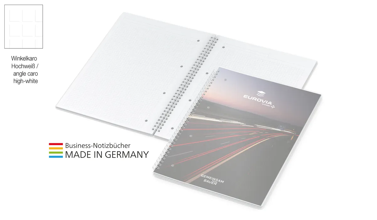 | Art.Nr.: | GE19209 | Lieferzeit: | 2-3 Wochen | Gewicht: | 0,290 kg | Format: | Blattformate: 225 x 297 mm (A4-Plus) · 148 x 210 mm (A5) jeweils inklusive 15 mm Perforationsrand links | Farbe: | frost transparent | Einbandmaterial (Umschlag): | Jung, frisch, aktuell: Polyprop ist ein attraktiver, umweltschonender und ausgesprochen strapazierfähiger Kunststoffeinband. Polyprop hat eine transparente gefrostete Oberfläche. | Umfang: | ca. 80 Blatt | Verarbeitung: | Wire-O-Bindung weiß | Ausstattung: | Notizseiten mit Winkelkaro · Mikroperforation | Material: | Hochweißes Schreibpapier 90 g/m² | Einzelverpackung: | Wellpapp-Versandtasche weiß: Nr. 23 - 285 x 200 mm (A5) · Nr. 43 - 350 x 250 mm (A4) | Verpackungseinheit: | A5: 50 / A4-Plus: 25 | Werbefläche: | siehe Standbogen | Druck: | 4C-Quality Digital inklusive | Druckfarben: | 4C-Euroskala | Mindestmenge: | 50 | Herkunftsland: | ![]() |