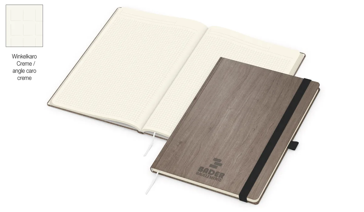 | Art.Nr.: | GE15805 | Lieferzeit: | 4-6 weeks | Gewicht: | 0,430 kg | Format: | Blattformate: 210 x 297 mm (A4) · 148 x 210 mm (A5) | Farben: | anthrazit · beige · dunkelblau · dunkelbraun · mittelbraun | Einbandmaterial (Umschlag): | Kunstleder-Einband mit charakteristischer Maserung von Holz, die man auch fühlen kann. Attraktive Blindprägung durch den Thermoeffekt. | Umfang: | 192 Seiten plus Einstecktasche | Verarbeitung: | Hardcover mit unwattierter Buchdecke · Buchblock und -decke mit abgerundeten Ecken · Lesezeichen creme und Kapitalband creme weiß · runder Rücken | Ausstattung: | Notizseiten mit Winkelkaro · Mikroperforation · Einstecktasche · Gummiband 15 mm und Stiftschlaufe schwarz | Material: | cremefarbenes Schreibpapier 90 g/m² | Option(en): | Geschenkbox (auf Anfrage) · einzeln einschweißen | Einzelverpackung: | Wellpapp-Versandtasche weiß: Nr. 23 - 285 x 200 mm (A5) · Nr. 43 - 350 x 250 mm (A4) | Verpackungseinheit: | A5: 40 / A4: 20 | Farben ab 25 VPE/Stück: | anthrazit | Werbefläche: | siehe Standbogen | Druck: | Blindprägung (I) | Druckfarben: | blind | Mindestmenge: | 25 | Herkunftsland: | ![]() |