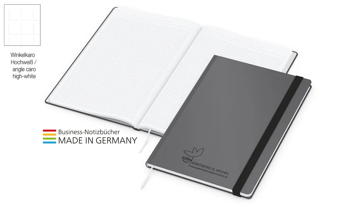 | Art.Nr.: | GE16002 | Lieferzeit: | 4-6 weeks | Gewicht: | 0,420 kg | Format: | Blattformate: 210 x 297 mm (A4) · 148 x 210 mm (A5) | Farben: | anthrazit · dunkelblau · rot · schwarz · weiß | Einbandmaterial (Umschlag): | Karton mit veredelter Oberfläche: Matt, modern in fünf attraktiven Farben als strapazierfähiger und preiswerter Bezugsstoff für alle Hardcover-Einbände. | Umfang: | 192 Seiten plus Einstecktasche | Verarbeitung: | Hardcover mit unwattierter Buchdecke · Buchblock und -decke mit abgerundeten Ecken · Lesezeichen · Kapitalband · runder Rücken | Ausstattung: | Notizseiten mit Winkelkaro · Mikroperforation · Einstecktasche · Gummiband schwarz 15 mm | Material: | Hochweißes Schreibpapier 90 g/m² | Option(en): | Gummiband in Sonderfarben · Stiftschlaufe · Geschenkbox (auf Anfrage) · einzeln einschweißen | Einzelverpackung: | Wellpapp-Versandtasche weiß: Nr. 23 - 285 x 200 mm (A5) · Nr. 43 - 350 x 250 mm (A4) | Verpackungseinheit: | A5: 40 / A4: 20 | Farben ab 25 VPE/Stück: | anthrazit | Werbefläche: | siehe Standbogen | Druck: | Heißfolienprägung (Einzelnamen) (E) · Siebdruck (H) · Heißfolienprägung (I) · Siebdruck-Digital (U) · Werbeseiten (W) | Druckfarben: | Prägung: gold, silber, schwarz-glänzend, blind (E) · Siebdruck: schwarz, weiß, gold, silber sowie Sonderfarben nach HKS oder Pantone (H) · Prägung: gold, silber, schwarz-glänzend, blind (I) · Siebdruck: 4C-Euroskala (U) · Werbeseiten: Digitaldruck oder Offsetdruck: 4C-Euroskala (W) | Mindestmenge: | 25 | Herkunftsland: | ![]() |