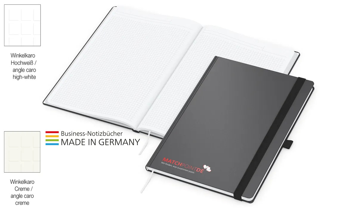 | Art.Nr.: | GE21204 | Lieferzeit: | 5 days | Gewicht: | 0,420 kg | Format: | Blattformate: 210 x 297 mm (A4) · 148 x 210 mm (A5) | Farben: | anthrazit · dunkelblau · rot · schwarz · weiß | Einbandmaterial (Umschlag): | Karton mit veredelter Oberfläche: Matt, modern in fünf attraktiven Farben als strapazierfähiger und preiswerter Bezugsstoff für alle Hardcover-Einbände. | Umfang: | 192 Seiten plus Einstecktasche | Verarbeitung: | Hardcover mit unwattierter Buchdecke · Buchblock und -decke mit abgerundeten Ecken · Lesezeichen · Kapitalband · runder Rücken | Ausstattung: | Notizseiten mit Winkelkaro · Mikroperforation · Einstecktasche · Gummiband und Stiftschlaufe definierten Farben (Einband anthrazit = schwarz · Einband dunkelblau = dunkelblau · Einband rot = silbergrau · Einband schwarz = schwarz · Einband weiß = silbergrau) | Material: | Hochweißes Schreibpapier 90 g/m² | Verpackungseinheit: | A5: 40 / A4: 20 | Werbefläche: | siehe Standbogen | Druck: | Siebdruck-Digital inklusive | Druckfarben: | 4C-Euroskala | Mindestmenge: | 10 | Herkunftsland: | ![]() |