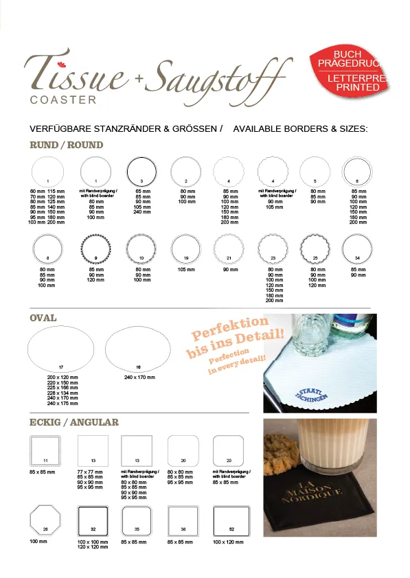 | Art.Nr.: | MAN-USB-13.1.1.1 | Lieferzeit: | 4-6 Wochen | Gewicht: | 0,375 kg | Format: | Ø = 80 · 85 und 90 mm oder 85 x 85 mm eckig (weitere Größen auf Anfrage) | Farbe: | weiß | Material: | 50 gr. Saugstoffpapier | Verpackungseinheit: | 1000/6000 | Werbefläche: | siehe Vorlagen | Druck: | Flexodruck: Druckfläche max. 40% | Druckfarben: | schwarz · HKS · Pantone | Mindestmenge: | 48 | Herkunftsland: | ![]() |