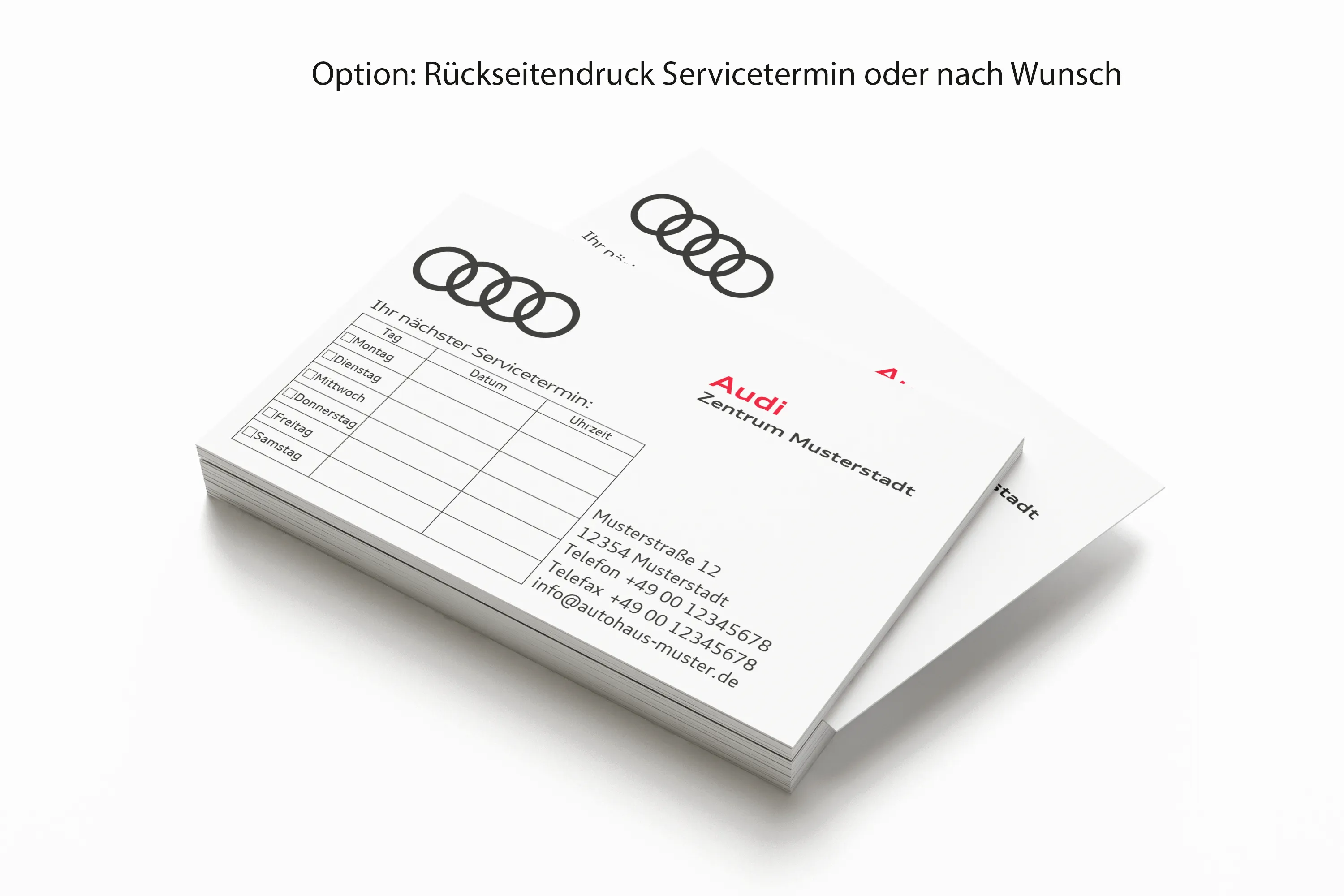 | product-no.: | DM40132 | delivery time: | 3-4 days | weight: | 0,100 kg | format: | 85 x 54 mm | equipment: | We create appointment cards are always looking for the current corporate identity directives or design guidelines of the Audi AG according to ISO norm or 100% audit. Alternatively, we can also create business cards according to your wishes. | material: | 250 g/m² professional silk | print: | digital printing | printing ink: | cmyk (4/0 colored on one side or 4/4 colored on both sides) | · delivery of your print data in response to the order confirmation email · layout and design work according to your specifications · correction deductions before the start of the print (except in the basic corner) | manufacturer: | deprismedia.com [Susann & Lars Ströse GbR] BahnhofstraĂŸe 32 DE-07422 Bad Blankenburg info@deprismedia.com www.deprismedia.com Tel. +49 3 67 41-1 88 36-0 |