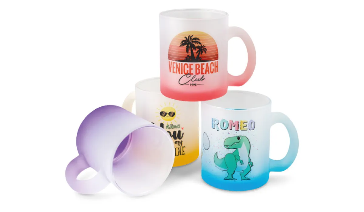 | product-no.: | Glastasse mit Farbverlauf 330 ml | delivery time: | 1-2 Wochen | weight: | 0,114 kg | size: | height: 95 mm · Ø = 82 mm · content: 0.33 l | Sizes: | XS · S · M · L · XL · XXL | colour: | WAHR | colours: | white/purple · white/blue · iridescent pink · iridescent purple · light blue · iridescent light blue · iridescent green · white · mint green · white/pink · light green · orange · red · silver | equipment: | The product is intended for hand washing | material: | glas | option(s): | printing ink in gold, silver or fluorescent paint | packaging units: | 36 | advertising area: | see downloads | print: | sublimation printing (photographic print) | printing ink: | cmyk | country of origin: | ![]() |