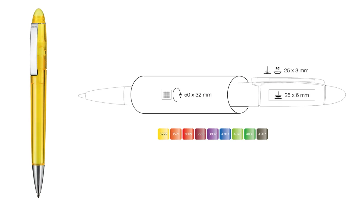 | product-no.: | RI10118 | delivery time: | 2-3 Wochen | weight: | 0,014 kg | colours: | 3229 sunflower yellow (PMS 123 C) · 3521 flamingo (PMS 165 C) · 3609 fire red (PMS 1795 C) · 3937 amethyst (PMS 267 C) · 4303 royal blue (PMS 286 C) · 4070 grass green (PMS 360 C) · 4507 smoke grey (PMS Black 7 C) | equipment: | Budget large-capacity refill, blue writing | material: | plastic with metal clip and metal tip | packaging units: | 500 | advertising area: | see button Penbuilder | print: | screen printing · pad printing · etching | printing ink: | HKS · PMS or RAL | min. quantity: | 500 | brand: | ![]() |