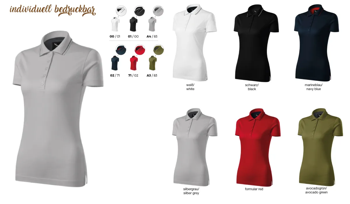 | product-no.: | GRAND 269 Damen Polohemd | delivery time: | 1-2 weeks | weight: | 0,160 kg | Sizes: | XS · S · M · L · XL · 2XL | colours: | white (00) · black (01) · navy blue (02) · silver gray (A4) · form red (71) · avocado green (A3) | material: | single jersey, 100% mercerized cotton | print: | embroidery · transfer printing · flocking and flex foil: we reserve the right to check the print data for feasibility! Please send us the print file in advance to: grafik@deprismedia.com (see under Templates -> Informations_zum_Druck_auf_Textilien.pdf). Please note the price conditions ! | printing ink: | embroidery: up to 12 colors included (color specifications according to HKS or Pantone) · transfer printing and sublimation printing (CMYK) · flocking and flex foil: colors (see under Templates -> Flock_und_Flexfolienfarben.pdf) | brand: | ![]() |