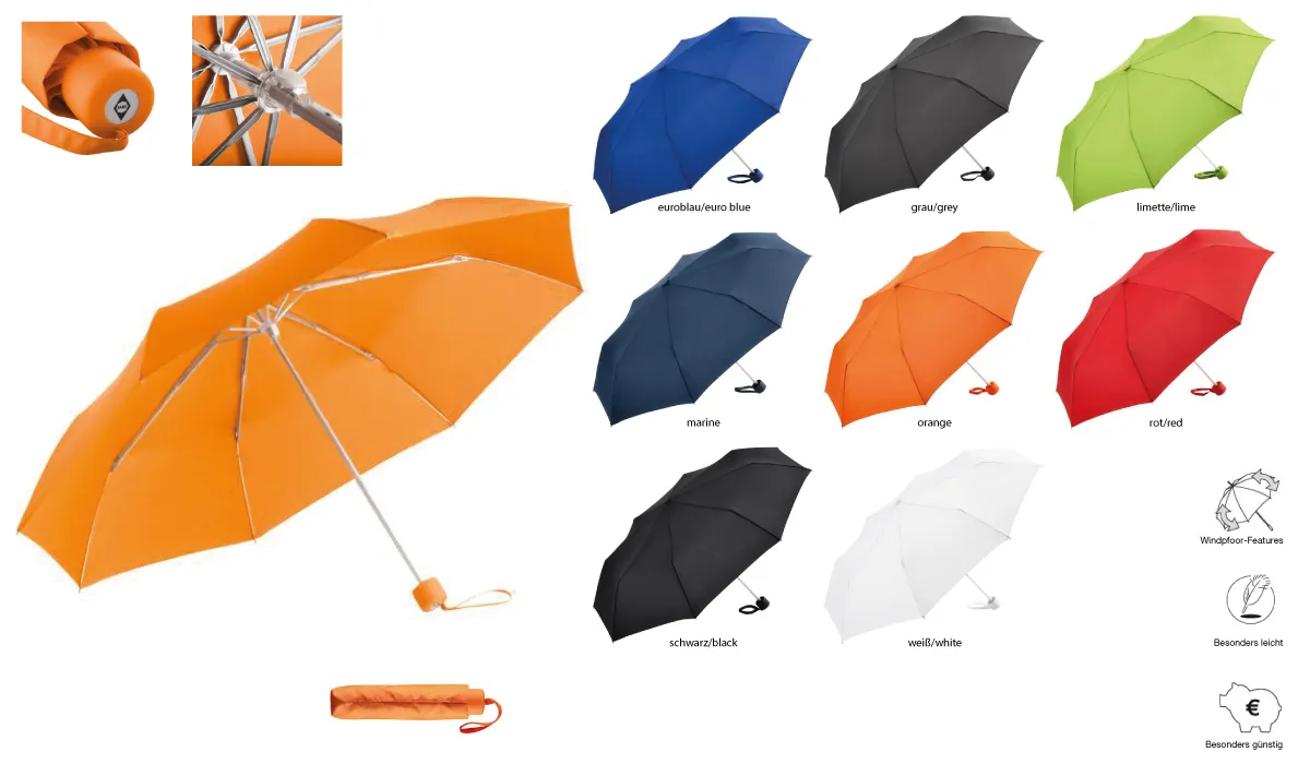 | product-no.: | 5008 | delivery time: | 2-3 Wochen | weight: | 0,170 kg | size: | Ă˜ 900 mm · closed length: 230 mm | colours: | euro blue · grey · lime · navy · orange · red · black · white | equipment: | number of wedge: 8 · frame: 3 pieces | material: | cover: 100% polyester pongee · handle: plastic · stick: aluminum | packaging units: | 24 | print: | on umbrella segment (same motif): sublimation · flex foil · flock foil · transfer printing · screen printing (max. 2 colors) · on closing strap (same motif): screen printing (1 color) · on case (same motif): screen printing (max. 2 -colored) · on handle: doming (photo sticker) | printing ink: | RAL · CMYK | min. quantity: | 24 | brand: | ![]() |