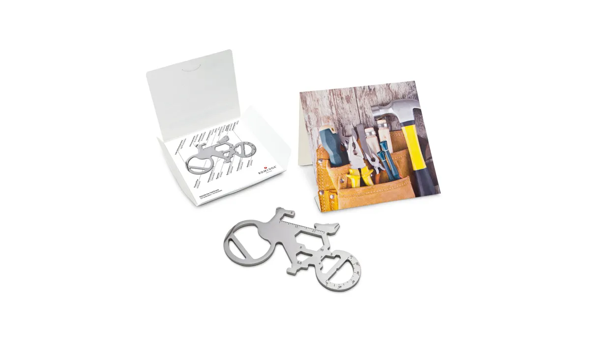 Geschenke mit Firmenlogo: Überraschen Sie Ihre Handwerker mit Multifunktionstools als Schlüsselanhänger: ein ideales Geschenk nicht nur zum Geburtstag oder zu Weihnachten und nicht nur für Männer. Mit den kleinen Begleitern von ROMINOX® haben Sie die praktischsten Werkzeuge wie Schraubenzieher, Lineal oder Sechskantschlüssel immer dabei, egal ob im Alltag, im Büro oder auf Reisen. Das Key Tool Bicycle / Fahrrad mit 19 Funktionen inkl. Einkaufswagenlöser kommt in einem „Werkzeug”-Mäppchen inkl. Funktionsbeschreibung. „An die Werkzeuge, fertig, los“! Finden Sie die perfekte Kombination aus Ihrem Lieblings Keytool und Motiv-Mäppchen. Auf Wunsch auch mit Gravur und/oder im Mäppchen im Eigendesign erhältlich.
