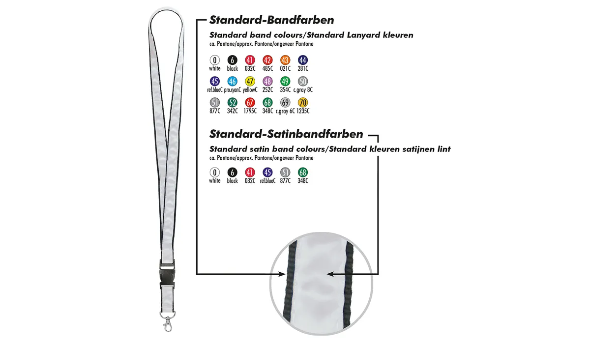 | Art.Nr.: | HE8126B | Lieferzeit: | 3-4 Wochen | Gewicht: | 0,018 kg | Abmaße: | Länge Standard: 490 x 23 x 3 mm oder 530 x 23 x 8 mm | Farben: | Standardfarben annähernd Pantone: 032C (rot) · 485C (rot) · 1795C (rot) · 021C (orange) · 281C (blau) · reflex blue · cyan · 252C (lila) · 354C (grün) · 342C (grün) · 348C (grün) · cool gray 6C · 877C (grau) · cool gray 8C · yellow · 1235C (sand) · schwarz · weiß/ Standard-Satinfarben annähernd Pantone: 032C (rot) · reflex blue · 384C (grün) · 877C (grau) · schwarz · weiß | Material: | Polyester/Metall | Werbefläche: | 20 mm: 760 x 11 (*30 x 11), 25 mm: 760 x 15 (*30 x 15), (*zwischen Karabinerhaken und Schnappverschluss) | Druck: | Siebdruck | Druckfarben: | HKS oder Pantone | Mindestmenge: | 500 | Herkunftsland: | ![]() |