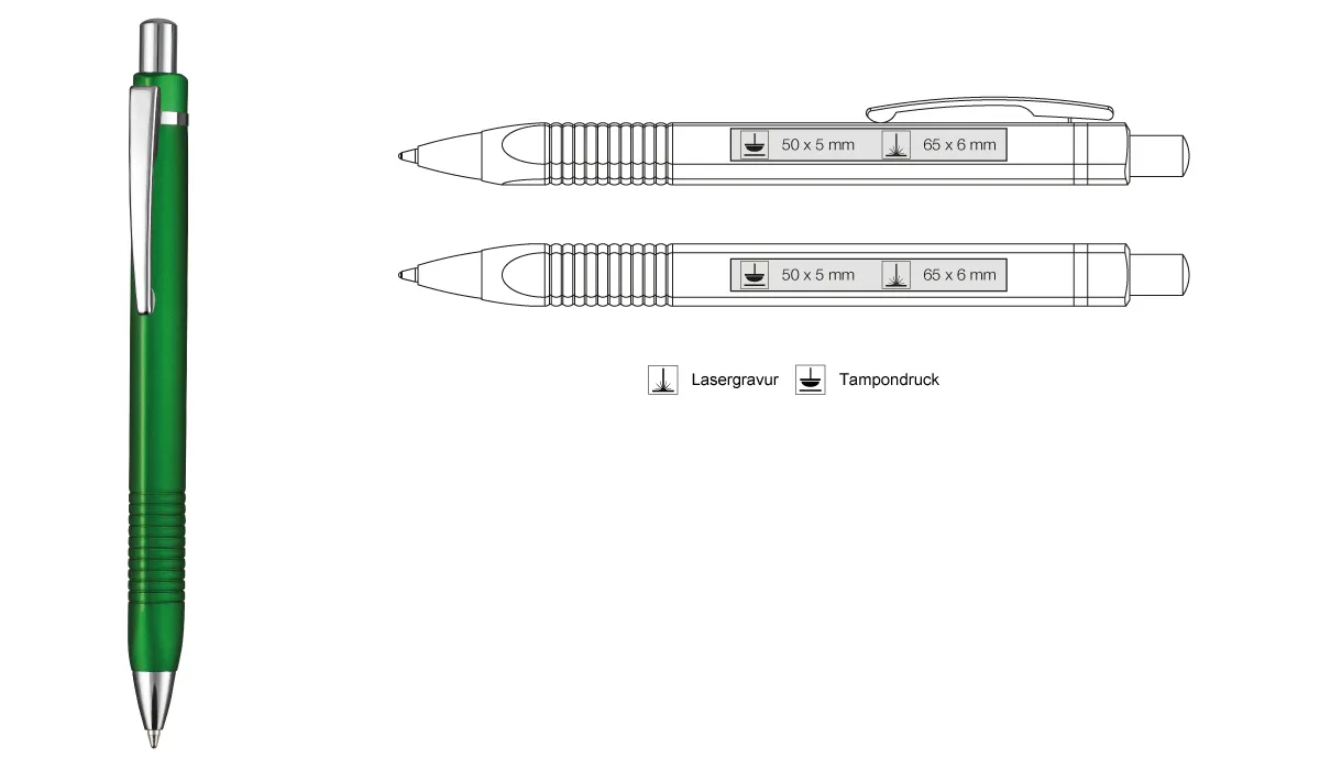 | Art.Nr.: | RI68918 | Lieferzeit: | 2-3 Wochen | Gewicht: | 0,021 kg | Farbe: | grün | Ausstattung: | Budget Metallmine blauschreibend | Material: | Metall | Verpackungseinheit: | 100 | Werbefläche: | siehe Button Penbuilder | Druck: | Lasergravur · Tampondruck | Druckfarben: | HKS · Pantone oder RAL | Mindestmenge: | 100 | Marke: | ![]() |