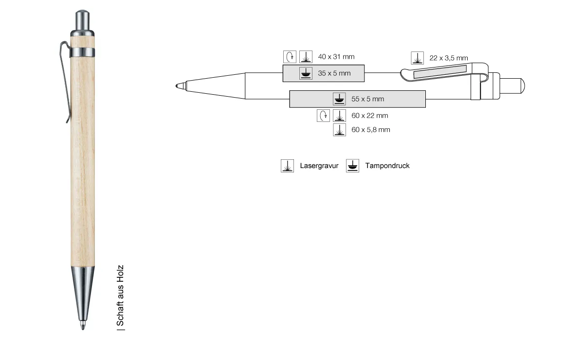 | Art.Nr.: | RI82600 | Lieferzeit: | 2-3 Wochen | Gewicht: | 0,022 kg | Ausstattung: | Budget Metall Großraummine in blau | Material: | Holz | Verpackungseinheit: | 500 | Werbefläche: | siehe Button Penbuilder | Druck: | Lasergravur · Tampondruck | Druckfarben: | HKS · Pantone oder RAL | Mindestmenge: | 100 | Marke: | ![]() |
