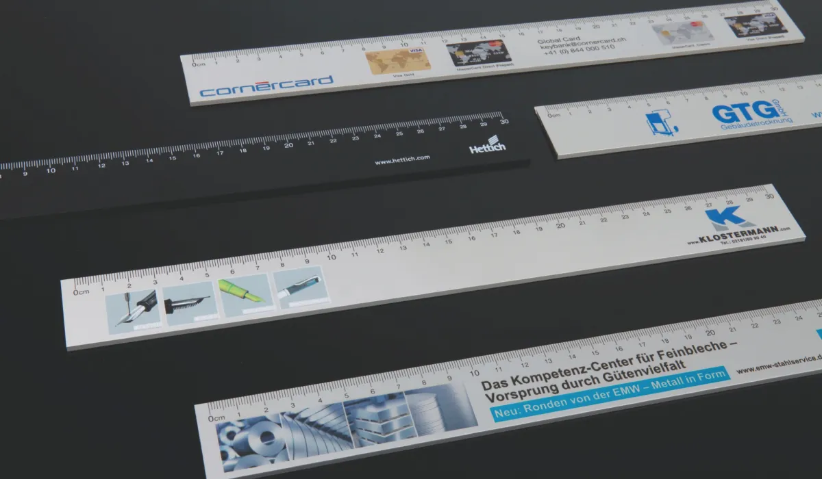 | Art.Nr.: | MEGL13 | Lieferzeit: | 6-8 Wochen | Gewicht: | 0,065 kg | Abmaße: | 300 x 33mm | Farben: | silber · schwarz | Ausstattung: | Skalierung: cm | Material: | Aluminium | Verpackungseinheit: | 100 | Werbefläche: | 300 x 17mm | Druck: | Tampondruck · Digitaldruck · Lasergravur | Druckfarben: | Tampondruck: HKS oder Pantone, Digitaldruck: 4C-CMYK | Mindestmenge: | 100 | Herkunftsland: | ![]() |